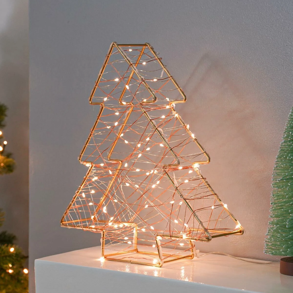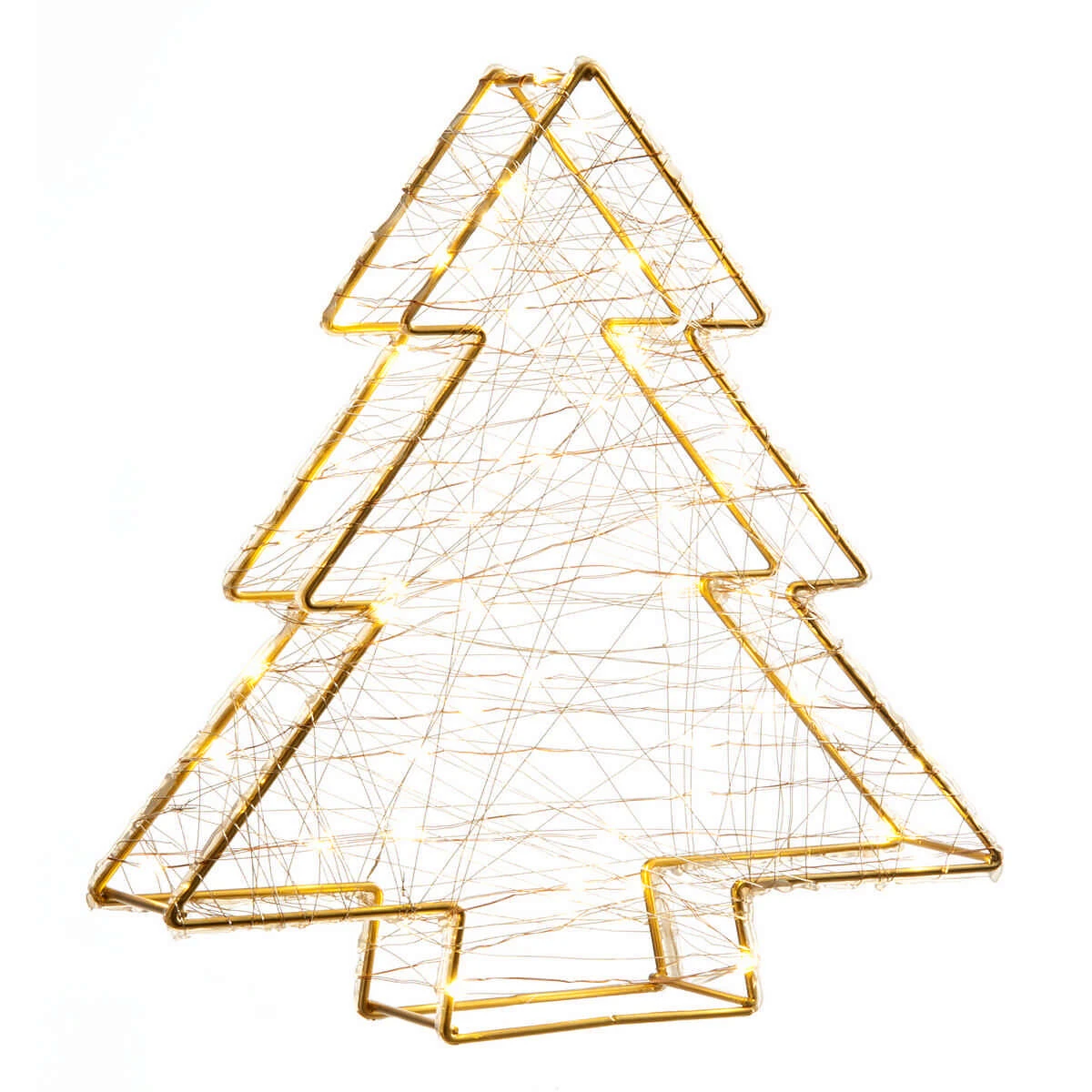 The warm white firefly LEDs, housed along the delicate gold wire, are wrapped across the metal frame of the tree in a zig-zag pattern, creating a magical winter wonderland effect. The tree looks incredible placed anywhere in the home, but is especially effective as a seasonal table top decoration.
