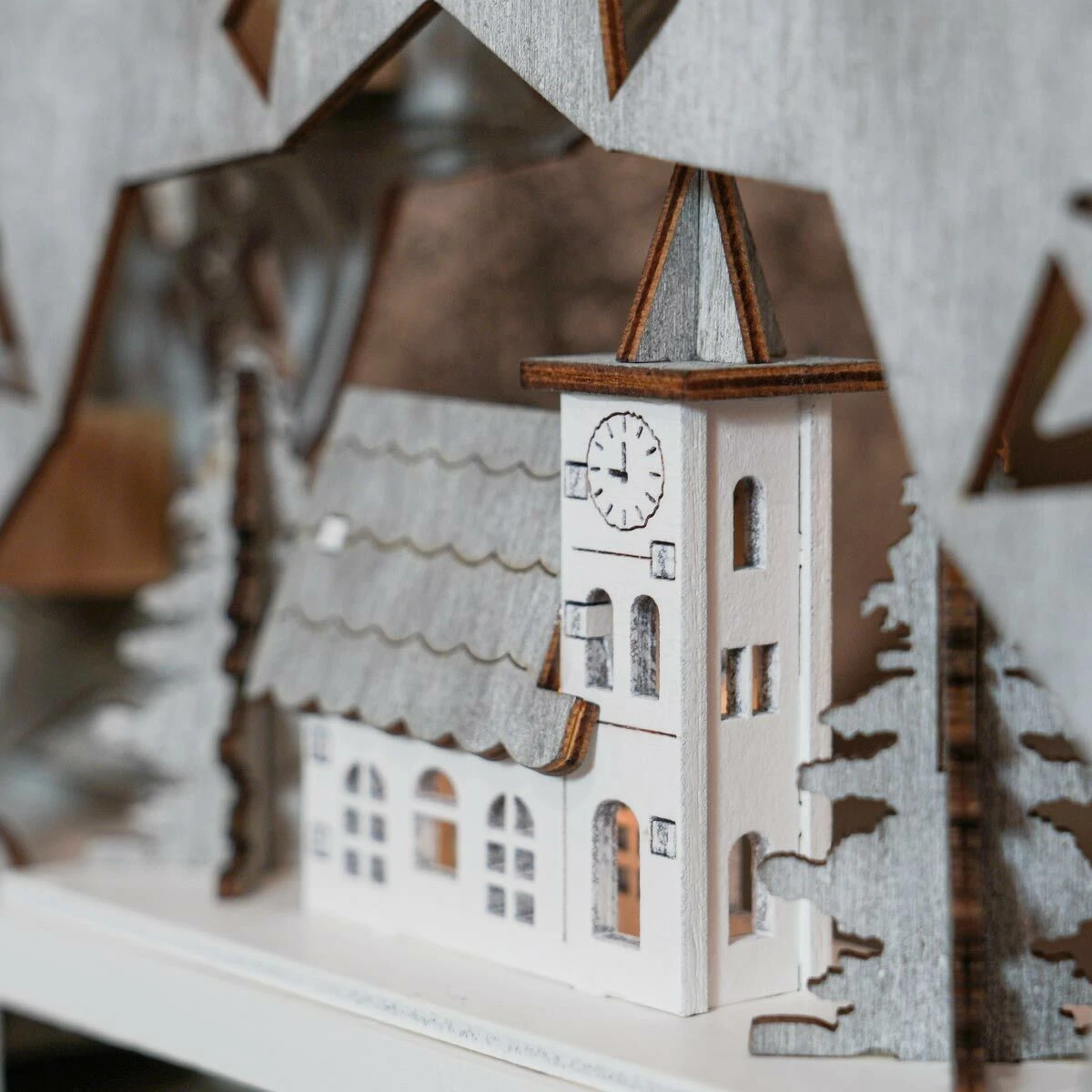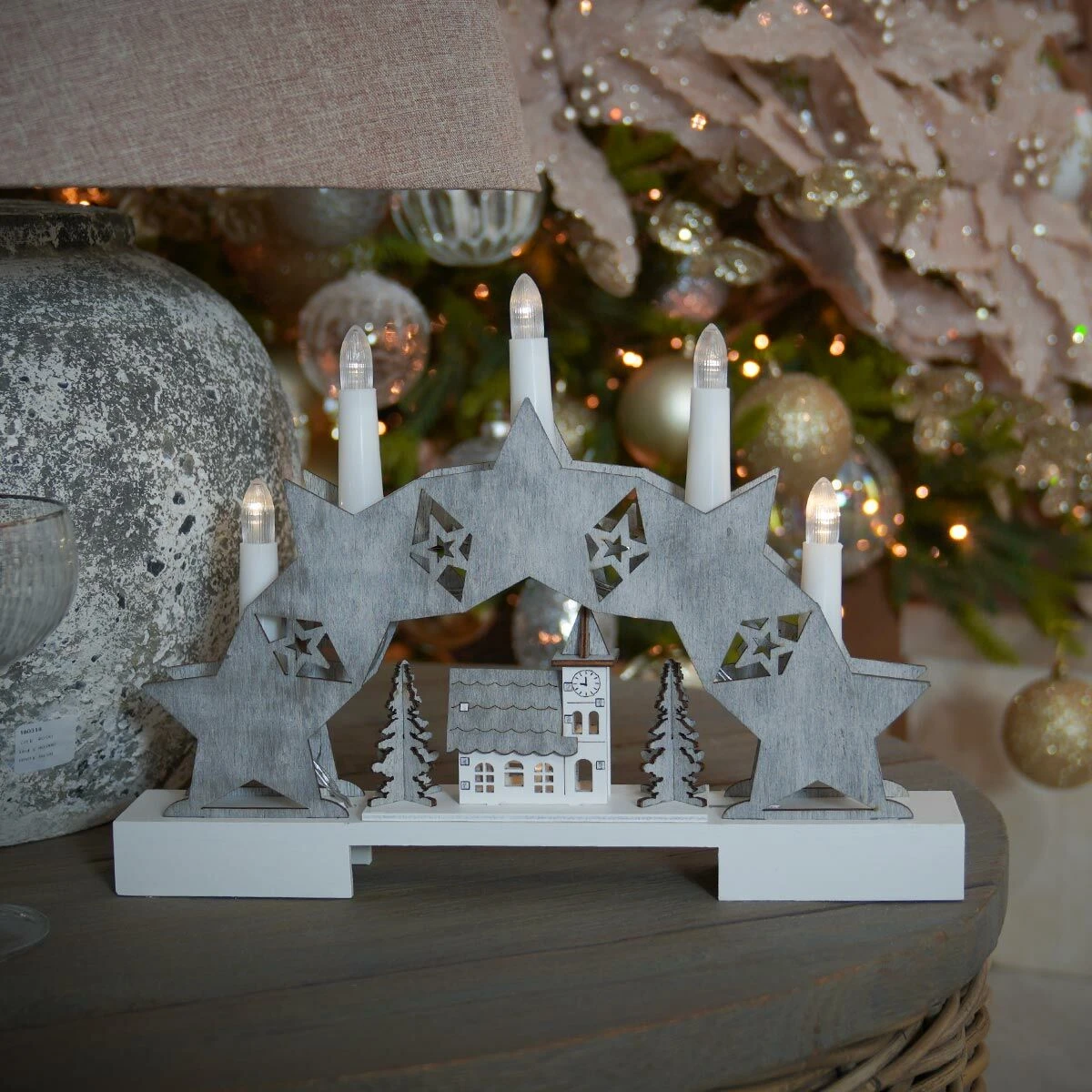 Completely wireless, this battery powered candle arch depicts 5 modern grey and white stars, complete with a quaint festive scene beneath. At 32cm high and finished with 5 welcoming candles, there’s a total of 6 warm white LEDs within this candle bridge – one for each candle and the final one highlighting the dainty festive setting.