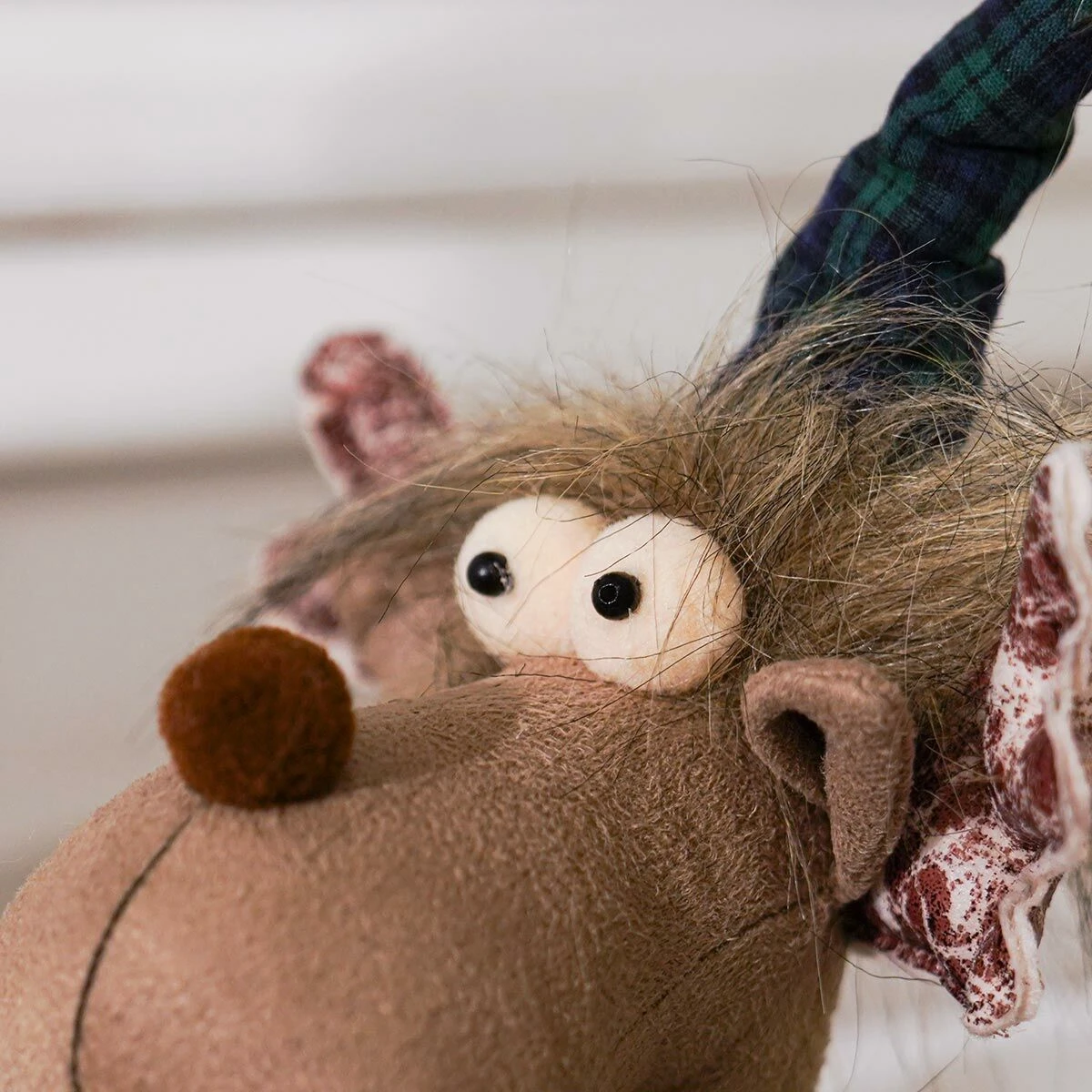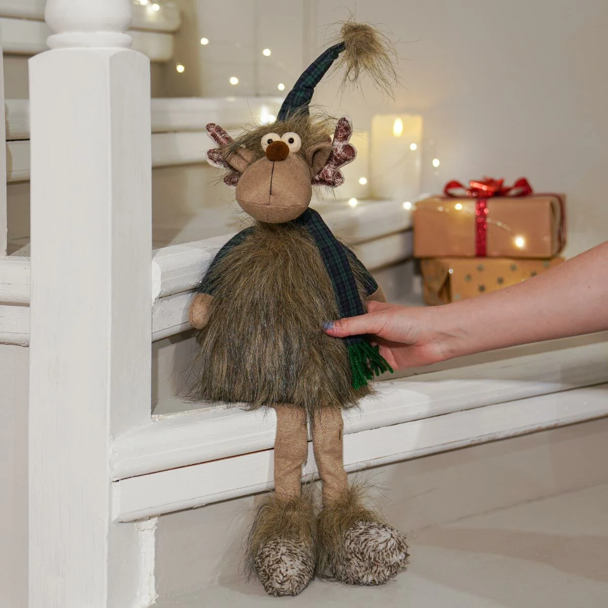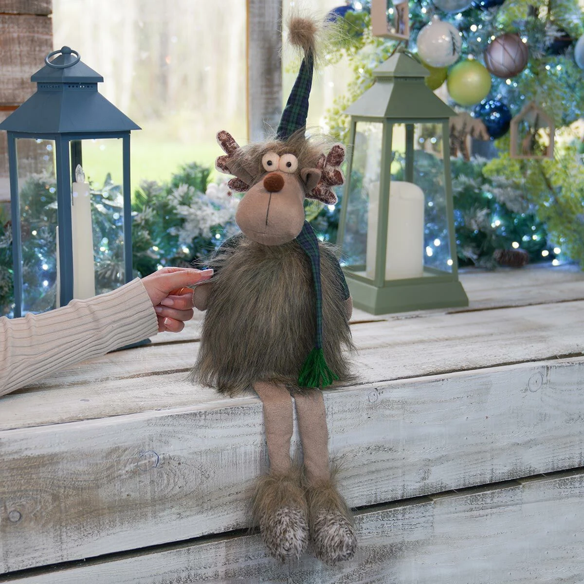 Charming and cheeky, this 58cm sitting reindeer Christmas gonk, with dangly legs and plush brown fabric, spreads Christmas cheer anywhere in the home.