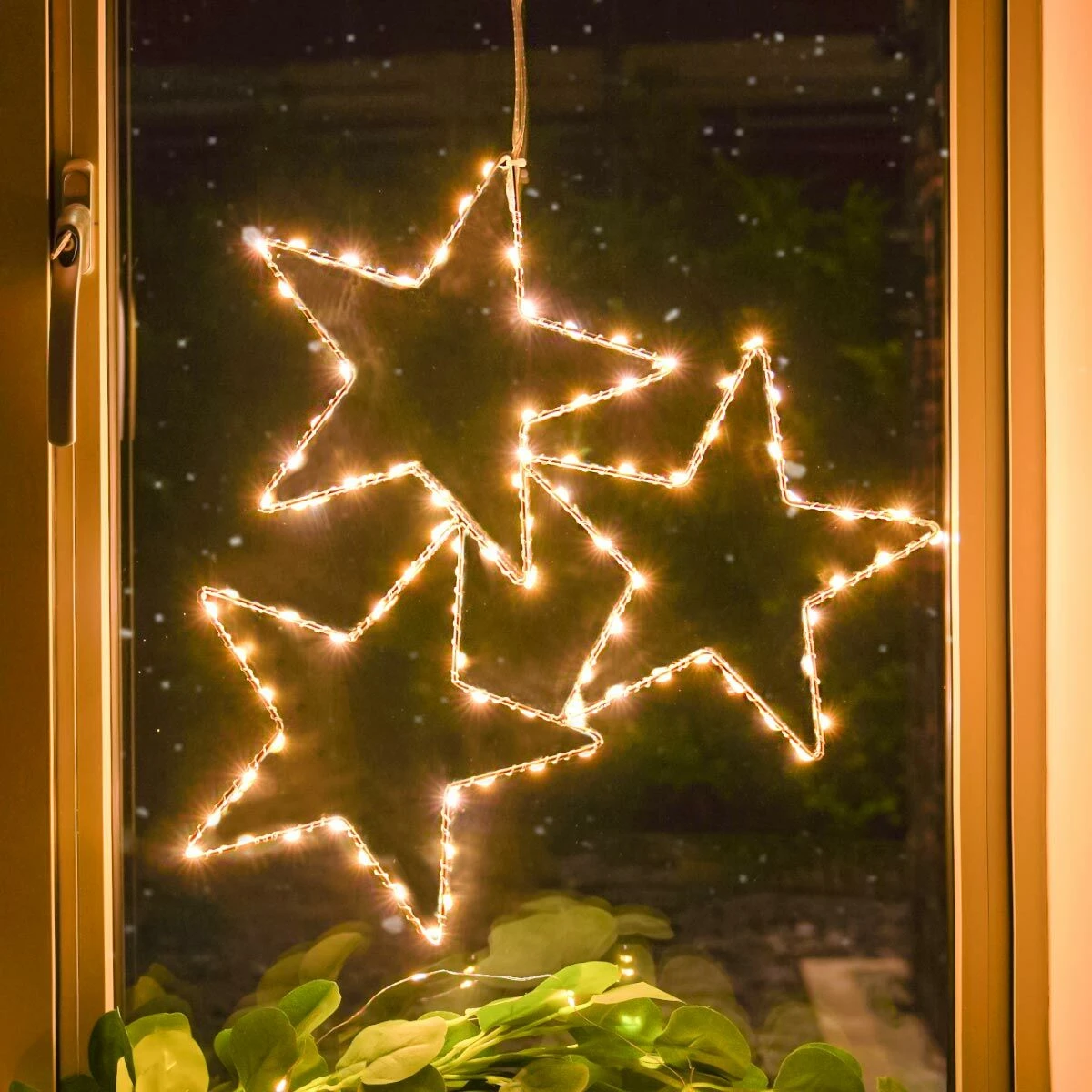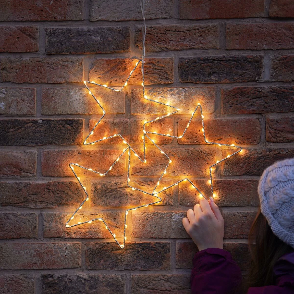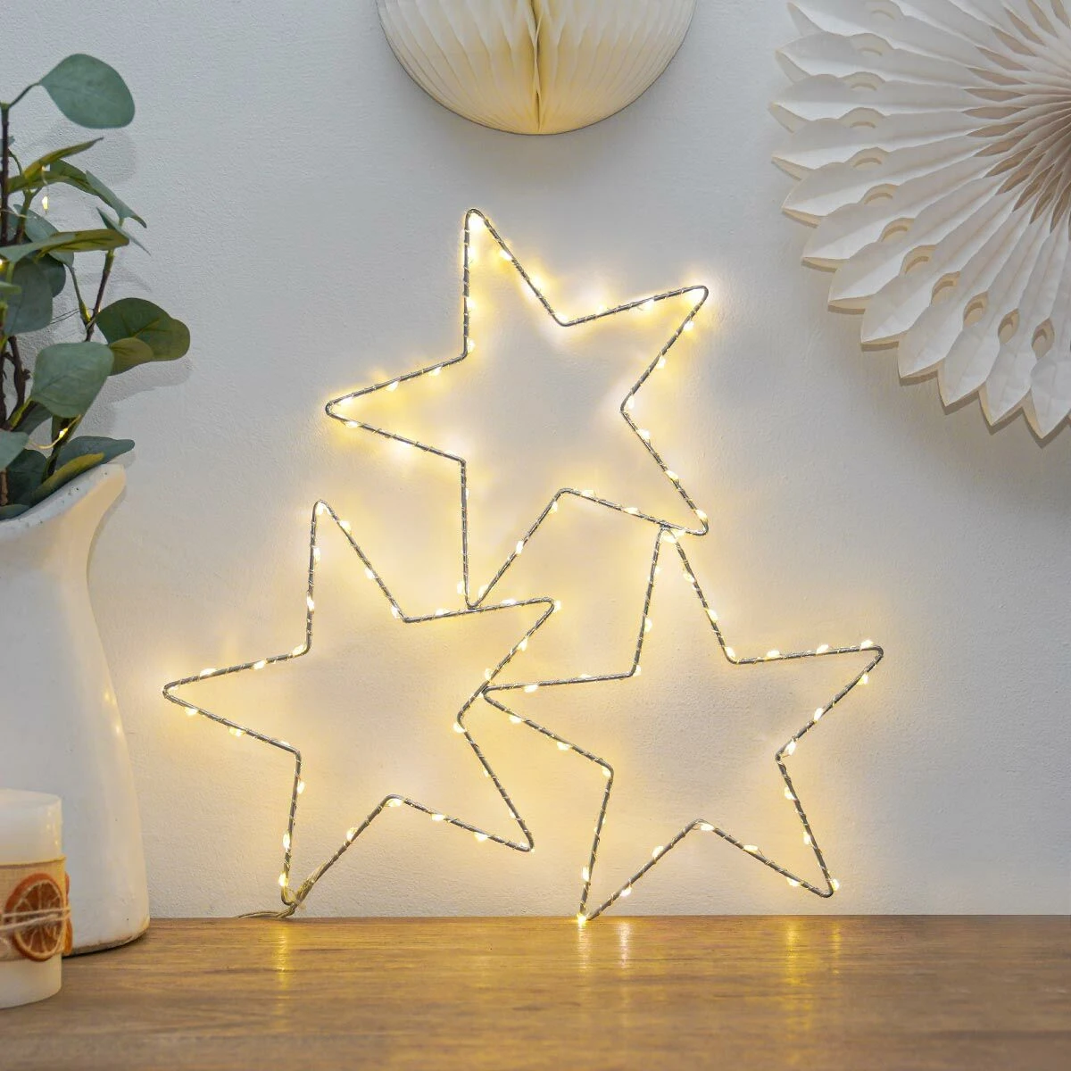 Create a supernova in and around your home this Christmas with this simply stunning trio of stars. The 3 2D conjoined stars are made from a sturdy black metal frame and come with 90 warm white LEDs perched along a silver wire. The generous 1m clear lead cable length from plug to bulb makes it easy to adorn your home in dazzling starlight year after year, whether it be indoors or out.